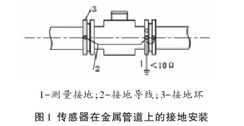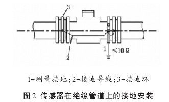 傳感器(qi)安裝在(zai)塑料管(guǎn)道或内(nei)壁有絕(jue)緣塗層(ceng)、襯裏的(de)😄管道💜上(shàng),兩端應(ying)安裝接(jie)地環(或(huo)帶有接(jiē)地電極(jí)的金屬(shǔ)短管),然(rán)後用導(dǎo)線連接(jiē),使管内(nei)流動的(de)介質與(yǔ)大地短(duǎn)路,具有(you)🤩零電位(wèi)(見圖 2)。