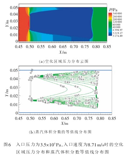 随(sui)着入口壓力增加(jia),空化範圍越來越(yuè)大,空化區域内蒸(zheng)汽體積分數也随(suí)着增大,當入口壓(yā)力Pi爲3.5×105Pa,入口速度爲(wei)8.71m/s時,模拟所得空化(hua)👣數爲0.44。如圖6所示,可(kě)以看出在孔闆🍉下(xia)遊0.3m以内大部分壓(yā)力區域達到蒸發(fā)壓力🧡3.166×103Pa,越靠近孔闆(pǎn)的地方蒸汽體積(jī)分數越高。