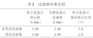 表2可(ke)見,使用(yong)了過濾(lǜ)器降低(dī)了轉子(zǐ)流量計(jì)偏高指(zhǐ)示誤差(chà),說明過(guo)濾器起(qi)到了穩(wen)流作用(yòng),提高了(le)校準精(jing)度。