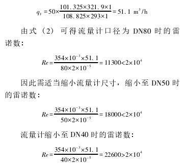 由(yóu)上述計(jì)算結果(guo)可知,當(dang)流量計(ji)縮徑至(zhì)DN40時,雷諾(nuo)數即可(ke)滿足❗要(yao)求。