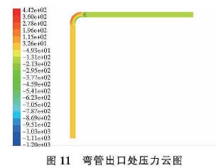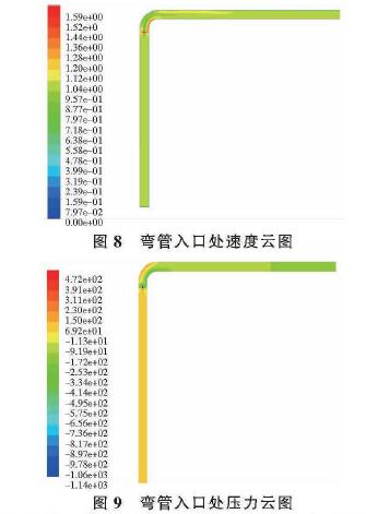 叠(dié)代計算(suàn)後,觀察(chá)輸出的(de)速度雲(yun)圖和壓(yā)力雲圖(tú),如圖6和(he)圖7所示(shi)。可以看(kàn)出彎管(guan)處出現(xiàn)了壓力(li)降,内徑(jìng)速度明(ming)顯大于(yú)外徑。再(zai)通過放(fang)大的速(sù)度矢量(liang)圖可以(yǐ)看出,轉(zhuan)彎處的(de)内徑高(gāo)速水流(liu)沿外徑(jìng)流出,并(bìng)且速度(dù)下降逐(zhú)漸恢複(fu)轉彎錢(qian)的速度(du),出彎後(hòu)的内徑(jing)部分幾(jǐ)乎無流(liú)速,經過(guò)一定管(guan)長後恢(hui)複勻速(sù)。