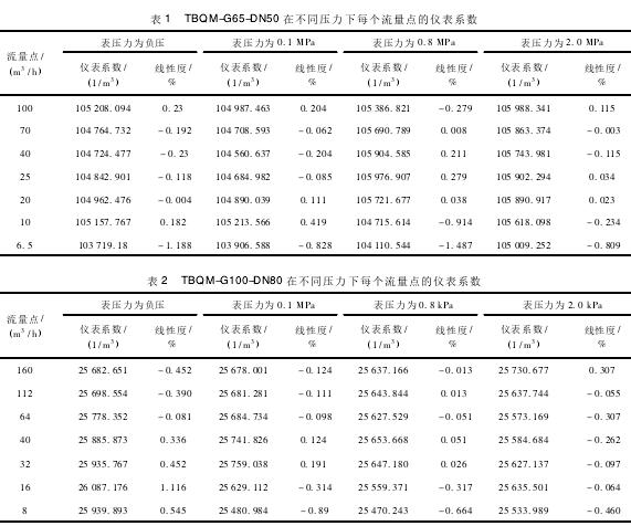不(bu)同壓力下每個(ge)流量計的儀表(biǎo)系數如表1和表(biao)2所示。