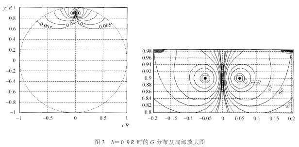 取(qu)b= 0.9R(R爲管道(dao)半徑),θ= 0.0555rad,繪(huì)制G分布(bù)并放大(dà)電極附(fù)近區域(yu)如圖3所(suo)示。