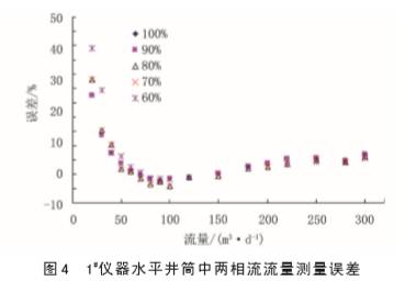 爲減小(xiǎo)低流量時的(de)測量誤差,改(gǎi)善低流量時(shi)的測量效果(guo),采取🏃♀️了在布(bù)傘集流器上(shang)部位置打孔(kong)分流流量‼️的(de)方法[9],通☎️過打(da)孔使⭐分流流(liu)量達到20%[10],分流(liú)使聚集在傘(san)跟部的油漏(lou)失🛀🏻一部分,從(cóng)而有效提高(gāo)流過傳感器(qi)的含水率。流(liu)道内含水♍率(lü)高有利于儀(yi)器更好地進(jin)行測量。圖5爲(wèi)水平井筒中(zhōng)1#儀器采取分(fèn)流流💯量方法(fa)在油水兩相(xiàng)流中進行‼️測(ce)量的相對誤(wu)差分布情況(kuang)。從🛀圖5可以看(kan)出,當含水率(lǜ)高于80%、流量大(da)于40m3/d時,測量相(xiang)對誤差在±5%以(yǐ)内。對比圖4和(he)圖5可以發現(xian):在含水率高(gāo)于80%、測量誤差(cha)在±5%以内時,流(liú)量測量下限(xian)🐇由原💜來的150m3/d降(jiang)低到40m3/d,明顯拓(tuò)寬了流量測(cè)量下限,儀器(qi)可應💯用的測(cè)量範圍更廣(guang)泛;分流後在(zài)流量大于40m3/d時(shí)測量相對誤(wu)差由原來的(de)±10%減小到±5%,顯🔴著(zhe)降低了測量(liàng)誤差。可見,采(cai)取⭕分流的方(fang)法拓寬了流(liú)量測量下限(xian)并減小了測(ce)量誤差,分流(liu)測量方法是(shì)可行的。