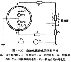 電磁流量(liàng)計 作爲一種(zhong)依靠電磁作(zuò)用原理工作(zuo)的流量儀表(biao),在使用的🏃♀️過(guò)程中會受到(dao)外部的各種(zhong)幹擾,用戶在(zài)安裝過程中(zhong)要特别注意(yì)避⭕免因爲外(wài)部的不良測(cè)量🐅環境對于(yu)儀表造成的(de)影響,針對于(yu)電磁流量計(jì)在使用過程(chéng)👄中受到的🔴最(zui)主要的🏃♀️幹擾(rao)類型做一個(gè)簡單的描述(shù)。 目前在工業(ye)生産中普遍(biàn)使用的電磁(ci)流量計,一般(ban)都采用💰50Hz電源(yuán)提供直接供(gòng)電,最後輸出(chu)一個和流量(liang)🐆成正比的電(dian)流信号(0-10mA或4-2OmA)。電(dian)☎️磁流量變送(song)器産生的流(liu)量信号爲mV級(ji)交流信号,通(tong)常設🏃🏻♂️定流體(tǐ)平均速度爲(wèi)1 m/s, 流量信号爲(wèi)1mV或0.5mV。實際測量(liang)中取得的電(dian)級信号除流(liu)♊量信号外還(hai)🈲混雜着同相(xiang)、正交和共模(mo)等幹擾信号(hao)✉️,特别是交流(liú)勵磁時幹擾(rǎo)電壓的幅值(zhi)較高,可達數(shù)十mV或更大㊙️,勢(shi)必嚴⭕重影響(xiǎng)測量。因此,抑(yì)制和消除幹(gan)擾🌍曆來是電(diàn)磁流量的關(guan)鍵。 1. 正交幹擾(rao)信号及抑制(zhi)産生的原因(yīn)及影響 所謂(wei)正交幹擾信(xìn)号是指其相(xiang)位和被側流(liú)量信号🌐相差(chà)90度,且不随流(liu)量變化,造成(cheng)這種幹擾信(xin)号主要有兩(liang)個原因。 一是(shì)在電極引線(xian)、放在輸人阻(zǔ)抗和被測介(jie)質構成的輸(shu)㊙️人回📧路中,由(you)于交變電磁(cí)場的作用,産(chǎn)生一個附加(jia)的感應電勢(shi),該💃🏻電勢和流(liu)體的平均流(liú)速無關,并且(qie)和流量信号(hào)電勢相位成(cheng)90度。 由式中可(ke)知感應電勢(shi)E和正弦磁場(chang)B是同相位的(de),而由于正弦(xian)交變磁場與(yu)輸人回路交(jiāo)鏈産生的附(fù)加幹擾電勢(shi)en爲 除上述原(yuan)因外,産生正(zheng)交幹擾的另(lìng)一個原因是(shì)交變磁通💘在(zài)被測導電流(liu)體中産生渦(wo)流。如果磁場(chǎng)在電極兩側(ce)産生的渦流(liú)不對稱,那麽(me)兩電極之間(jiān)也會産生附(fù)加的正交幹(gan)擾電勢差。消(xiao)除🐉正交幹擾(rǎo)的方法很多(duo),目前主要🍓采(cai)用的方法,一(yī)個是利用信(xin)号引出線路(lù)自動補償,另(lìng)一個是在主(zhu)放級中對于(yu)90度♊幹擾信号(hao)進行深度負(fu)反饋,而🎯後采(cai)用相敏電路(lù),使正交幹擾(rao)大大削弱.通(tōng)常是同時采(cai)取這兩種措(cuò)施。 關于信号(hao)引線自動消(xiao)除的方法如(ru)圖4-28所示。圖中(zhōng)電極A引出兩(liang)☁️根線和電位(wèi)器R、串接。電極(ji)B的引線通過(guò)下一環節前(qian)置放大級的(de)輸人電阻(即(ji)爲電極引出(chu)信🙇🏻号的負載(zai)電阻RL) RL和電位(wèi)✉️器的滑動觸(chu)點相連,這就(jiu)構成兩個與(yǔ)磁力線垂直(zhi)的回路。調節(jie)滑動❗觸點的(de)位置,使兩回(hui)路中電流相(xiang)等💛,則在兩電(diàn)極間的流體(tǐ)中✨,無正交感(gǎn)應電流流過(guo),這樣就可大(da)部分消除正(zheng)交🤩幹擾。 其餘引人(ren)的正交幹擾(rǎo)經過主放大(da)器後,經過對(duì)90度幹擾信号(hao)⁉️的☀️相敏整流(liú),驅動由旁熱(rè)式熱敏電阻(zu)組成的交流(liú)不平衡電橋(qiao),再将不平衡(héng)輸出引至主(zhǔ)放大器的輸(shū)人端構成負(fu)反饋,從🔆而就(jiù)可有效地抑(yi)制殘餘的90度(du)幹擾信号。 2.同(tóng)相幹擾信号(hao)及抑制産生(sheng)的原因及影(ying)響 同相幹擾(rǎo)是指兩個電(dian)極分别對地(dì)有一幅值和(hé)相位相同的(de)幹🎯擾信号,産(chan)生同相幹擾(rǎo)的原因主要(yao)有兩個㊙️。 一是(shì)由于激磁繞(rào)組和電極之(zhi)間的靜電感(gan)應引起的同(tóng)相幹擾,如圖(tú)4-29所示,在激磁(cí)繞組和電極(ji)A, B之間存在絕(jue)緣電阻RM和🔞分(fen)布電容Cf,激磁(ci)電壓通過RM和(he)Cf及兩電極之(zhī)間的内阻,對(duì)地産生同相(xiàng)💃的幹擾電勢(shì)et。 二是由地電(dian)流引起的同(tong)相幹擾電勢(shì)。如果在流最(zui)計🍓附近存在(zai)🈲大功率的電(diàn)器設備,特别(bié)是因絕緣不(bu)好而發生漏(lou)電時,地💞電流(liú)将使不同接(jie)地點電位不(bu)同,如圖4-30所示(shì),檢測器電極(ji)和被測介質(zhì)🈲相接觸,而轉(zhuǎn)換器是接地(dì)的。由于被測(ce)介質和轉換(huàn)器的接地點(diǎn)不同,這樣一(yī)來由地電流(liú)造成的兩不(bu)同接地點的(de)電位差被引(yǐn)人😘轉換器,構(gòu)成幹擾電勢(shì)et。 爲了消除幹(gàn)擾對于電磁(cí)流量計的影(ying)響,對于靜電(dian)效應,應💃采取(qu)嚴格的屏蔽(bì)措施,使分布(bù)電容大大減(jian)🤟小,同時降低(di)激📞磁電壓。對(duì)于地電流造(zào)成的幹擾,應(ying)盡量遠離大(dà)電功率電器(qi)設備,使轉換(huàn)器、被測介質(zhì)、管道一點接(jiē)地,也可采取(qǔ)轉換器“浮空(kong)”措☀️施。轉換器(qì)的前置放大(da)級采用差分(fèn)輸人電路。 3.電(dian)源電壓與頻(pin)率波動影響(xiang)補償電源電(dian)壓的波動将(jiang)使磁場強度(dù)發生變化,這(zhe)将直接影響(xiang)流量信号E的(de)數值。 電源頻(pin)率的變化引(yin)起鐵損和激(ji)磁線圈感抗(kang)的波動,因而(ér)也将造成流(liú)量信号E的波(bō)動。爲了補償(cháng)上述參數波(bo)動造成的測(cè)量誤差,轉換(huan)器中應用霍(huò)爾元件構成