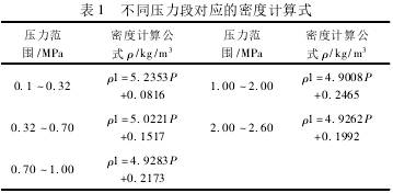 解決這(zhe)個矛盾(dun)的方法(fa)是分段(duàn)拟合,即(jí)在不同(tóng)的壓力(lì)段采用(yong)不🌍同的(de)系數和(he)常數。表(biǎo)1所示爲(wei)不同壓(ya)力段對(dui)應的不(bu)同密度(du)計算式(shi)[4]。