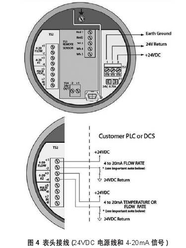 熱式(shì)質量流量(liàng)計需要單(dān)獨提供24VDC直(zhi)流電源,因(yin)此需要增(zēng)加🚩1面220VAC轉24VDC的(de)就地電源(yuán)箱。表頭處(chù)接線如下(xià)圖4所示,右(yòu)♌側接24VCD電源(yuan)線來⭕自就(jiù)地電源箱(xiāng),左側接信(xin)号線送至(zhì)DCS。Fox熱式流量(liang)計的4-20mA輸出(chu)均爲無源(yuán)輸出,需DCS側(cè)提供額外(wai)的24VDC電源,改(gǎi)造後✨的流(liu)量計無須(xū)壓力和溫(wen)度補償。