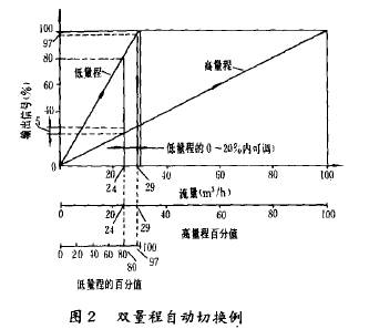 流量(liang)大幅度(du)變化的(de)使用場(chang)所,如能(neng)按照所(suǒ)側流t大(da)小改變(bian)流量🈲範(fan)圍(滿量(liang)程流量(liàng)),可以提(tí)高側t精(jing)确度。在(zai)許多高(gāo)性能儀(yí)表💘中設(shè)🌈有量程(cheng)切換功(gong)能。有利(li)用外部(bù)觸點信(xin)号🤩來切(qie)換量程(cheng)的,最多(duo)能切換(huan)四個流(liú)量範圍(wéi);内部自(zì)動切換(huan)有雙量(liang)程和三(san)量程。圖(tu)2所示💃🏻是(shi)雙量程(chéng)切換例(lì),設流量(liàng)範圍0~100m3/h,雙(shuāng)量程🤞所(suo)設定低(di)量程爲(wei)30 m3/h,高量程(cheng)爲100m3/h。當流(liú)量開始(shi)從零漸(jian)漸增加(jiā),先沿低(di)量程線(xiàn)上🤟升,當(dāng)增加到(dao)97%(約29m3/h時,自(zi)動切換(huan)到高量(liang)程線。相(xiàng)反流量(liang)從100 m3/h沿高(gao)量程線(xiàn)減小到(dao)約24 m3/h (商量(liang)♌程輸出(chū)的24%)時,自(zì)動切換(huan)到低量(liàng)程線輸(shū)出♻️80%的地(di)方。