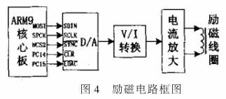 的(de)勵磁電(dian)路的任(rèn)務是向(xiàng)勵磁線(xiàn)圈提供(gong)一穩定(dìng)的驅動(dòng)電🈲流。電(dian)🥵流波形(xing)爲方波(bō)、三值方(fāng)波和梯(tī)形波[11]等(děng)形式,波(bō)形變化(hua)🌏的目的(de)是結合(he)信号處(chù)理電路(lù),分析在(zai)不同勵(lì)磁方式(shi)下電磁(cí)流量計(ji)的精度(du)、零點穩(wěn)定性和(hé)抗能力(li)等多項(xiàng)🤩指标。該(gai)電路由(yóu)核心闆(pan)的SPI2口輸(shū)出數字(zì)量,經過(guo)D/A轉換形(xing)成模拟(nǐ)信号,經(jing)V/I轉換激(ji)勵和帶(dài)有電流(liu)負反饋(kui)的電流(liu)放大器(qi)輸出,适(shi)合各種(zhong)勵磁波(bo)形的🧑🏽🤝🧑🏻變(bian)化。結構(gòu)框圖如(ru)圖4。D/A轉換(huan)電路采(cǎi)用AD7243芯片(piàn)[5],實現12位(wei)的SPI同步(bù)串行♊輸(shu)入,-5~+5V的雙(shuāng)極性輸(shū)出。與ARM9核(hé)心闆的(de)SPI2口對接(jie)💞,如圖4所(suǒ)示。