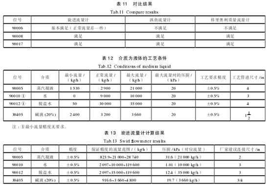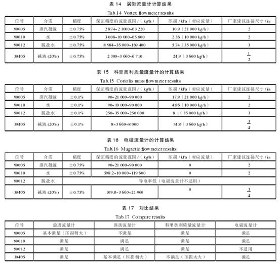 測量液(yè)體時,選(xuǎn)擇旋進(jin)流量計(ji)(精度爲(wèi)液體±0.5%)、渦(wō)街流量(liàng)計(精🐕度(du)爲液體(ti)±0.75%)、科裏奧(ao)利質量(liang)流量計(ji)(精度爲(wèi)液體±0.1%)和(he)電磁流(liu)量計(精(jing)度爲液(yè)體±0.5%)進行(hang)對比分(fèn)析。表12爲(wei)工藝條(tiao)件,表13~表(biao)16爲3種流(liu)量計的(de)選型後(hou)的量程(chéng)範圍和(he)壓力損(sǔn)🌂失,通過(guò)表⭐17的對(dui)比,可😍知(zhī)流量計(jì)是否滿(man)足🏃工藝(yì)條件要(yao)求。