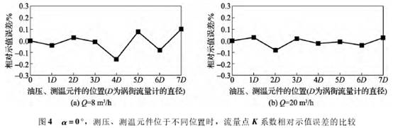 如(ru)圖4所示,圖中橫(héng)坐标爲0,表示無(wu)模拟元件影響(xiang),1D~7D表🚩示模拟元件(jian)所放的位置,縱(zong)坐标表示渦街(jiē)流量計K系數的(de)相對示值誤差(chà)。從圖4(a)中可以看(kàn)出,當α=0°、流量點Q=8m3/h,模(mo)拟元件在3D~7D時,對(duì)流量計的K系數(shù)影響比較大,最(zui)大影響接近0.2%。而(ér)當流量⚽增加至(zhi)Q=20m3/h時,模拟元件對(duì)流量計K系數影(yǐng)響比較平穩,保(bao)持在±0.1%以内。