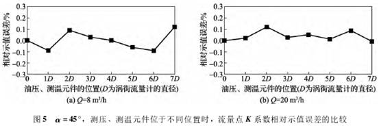 當α增(zeng)加至45°,流量點Q=8m3/h,模(mo)拟元件位于不(bu)同位置時,K系數(shù)的相對示值誤(wu)差位于±0.1%之間,表(biǎo)示模拟元件放(fàng)置不同位置,可(ke)以導緻K系數變(bian)大或變小(圖5(a))。在(zai)大流量情況下(xià)(Q=20m3/h),從圖5(b)中,可以發(fa)現K系數幾乎都(dou)是比實際值變(biàn)大的,且變♻️化幅(fu)度基本位于0%~0.1%範(fàn)圍。