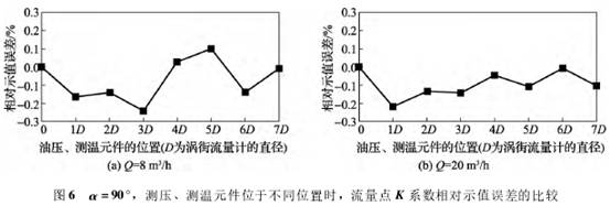 繼續增大α至(zhi)90°,即模拟元件和(hé)渦街發生體相(xiàng)互垂直。從♍圖6(a)中(zhong)可🙇♀️以看出,當流(liu)量點Q=8m3/h,模拟元件(jian)位于不同位☀️置(zhi)時🏃♀️,K系數的相對(dui)示值誤差波動(dong)很大,最大變化(huà)多💜至0.25%。當流量Q爲(wei)20m3/h,模拟元件位于(yu)1D處時,K系數相對(dui)示值誤差減小(xiǎo)約0.2%;而在2D~7D處,K系🐪數(shu)變化平穩,相對(dui)示值誤差位🌈于(yú)-0.15%~0%範圍,即說明流(liú)量計的K系數比(bi)實際🔱值變小。