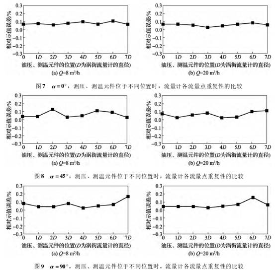 從圖7中(zhōng)可以看出,當α=0°時(shí),不論在0.4Qmax=8m3/h,還是Qmax=20m3/h條(tiáo)件下,流量點☁️的(de)重複性🏒很穩定(dìng),這說明模拟元(yuan)件在各安裝點(diǎn)對🌍流量🌂計重複(fú)性♋的影響是有(yǒu)限的。
