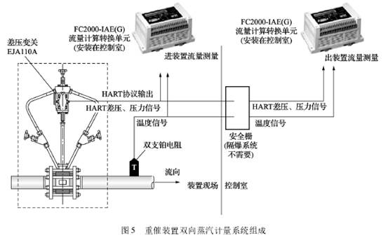 該裝(zhuang)置中低(dī)壓蒸汽(qì)母管中(zhong)的蒸汽(qi)流向屬(shu)于典型(xíng)的🈚雙向(xiàng)流,因此(cǐ),安裝于(yu)裝置兩(liǎng)條蒸汽(qi)母管線(xiàn)上的🚩流(liu)量計應(yīng)能實現(xiàn)雙向流(liú)🌐量測量(liàng)。應用一(yī)體化雙(shuang)向✂️孔闆(pǎn)流量計(ji)實現重(zhong)催裝置(zhi)進♌出裝(zhuāng)置兩個(ge)方向的(de)🚶計量方(fāng)案及系(xi)統組成(cheng)如圖5所(suo)示。
