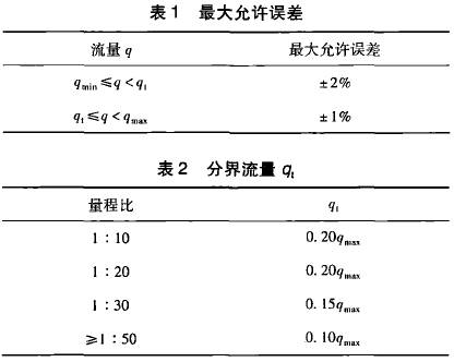 由表(biao)1可知,流量(liang)計在分界(jiè)流量至最(zuì)大流量之(zhī)間時(q,≤q≤qmx)精度(dù)等級可達(da)到1.0級,在最(zui)小流量和(hé)分界流量(liang)之間時(qmin≤q<q,)流(liú)量計的精(jīng)度等級降(jiàng)低至2.0級。選(xuǎn)擇的兩套(tao)渦輪流量(liàng)計🐅量程比(bi)同爲1:20,根💋據(jù)表2可以得(de)出: