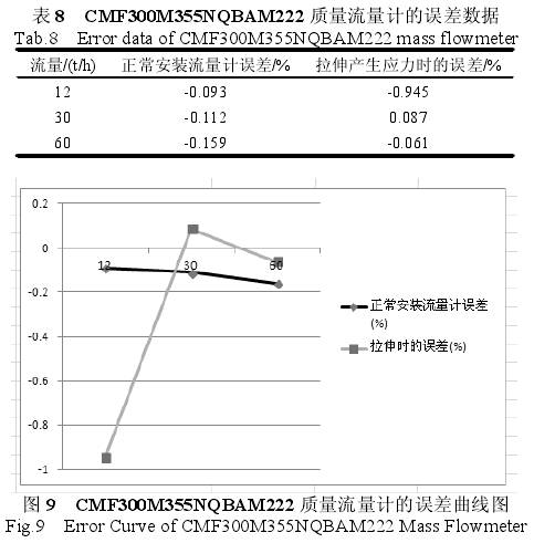 将(jiang)質量流(liú)量計放(fang)在兩端(duan)固定好(hǎo)的管道(dao)上,讓質(zhi)量流量(liang)計兩端(duan)法蘭與(yǔ)管道兩(liǎng)端法蘭(lán)有一定(dìng)的距離(li),中間加(jiā)多塊石(shí)棉墊,防(fáng)止漏水(shuǐ),緊固法(fa)蘭,使質(zhi)量流量(liàng)計産生(sheng)應力。通(tōng)過實驗(yàn)觀測應(ying)力對質(zhi)量流量(liàng)計計量(liang)結果的(de)影響。具(jù)♍體數據(jù)見表8~9,曲(qu)線圖見(jiàn)圖9~10。