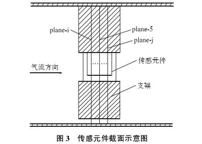 采(cai)用FLUENT軟件10-1]1分(fèn)别對這9種(zhong)模型設置(zhi)相同的邊(bian)界條件,進(jìn)行數值模(mó)拟計算。分(fèn)别計算傳(chuán)感元件不(bú)同位置的(de)平均速度(du)。選取傳感(gǎn)元件中心(xin)截面的編(bian)号爲plane-5。按軸(zhou)向方向在(zài)plane-5前後分别(bie)依次取5個(ge)截面‼️,前面(mian)兩截面平(píng)行距離爲(wèi)0.24 mm,分别編号(hao)爲plane-0, plane- 1, plane-2...共11個截(jié)面,如圖3所(suo)示,這些截(jié)面上的面(mian)平均速度(dù)可通過數(shu)值計算獲(huò)得。