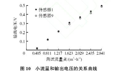 由(yóu)于不同的(de)流量範圍(wei)測量原理(li)不同,流量(liang)測量實驗(yàn)分爲♉2部分(fen),其中小流(liu)量的測量(liàng)範圍爲0.405m'/h~2.841 m'/h。在(zài)不同的㊙️流(liú)量🌈點對輸(shū)出電壓⭐V2進(jìn)行三次測(cè)量,獲得流(liú)量與平均(jun1)輸出電壓(ya)的關系曲(qu)線如圖10所(suo)示。傳感器(qì)1在小流量(liàng)測量中,不(bú)同流量與(yǔ)輸出電壓(ya)關系爲❓星(xing)形點,測📱量(liàng)重複性最(zui)大值爲0.5%。傳(chuan)感器9在小(xiao)流量測量(liang)中,不同😘流(liu)量與輸出(chu)♊電壓關系(xi)爲圓形點(diǎn),測量重複(fu)性㊙️最大值(zhi)爲0.8%。比較🎯傳(chuan)感器🎯1和傳(chuan)感器9的輸(shū)出特性,可(kě)知傳感器(qi)9由于開孔(kong)略大,輸出(chū)的電壓值(zhi)略微偏小(xiao),而且重複(fu)性略大于(yu)傳感器1,與(yǔ)仿真的⚽結(jie)果相同。