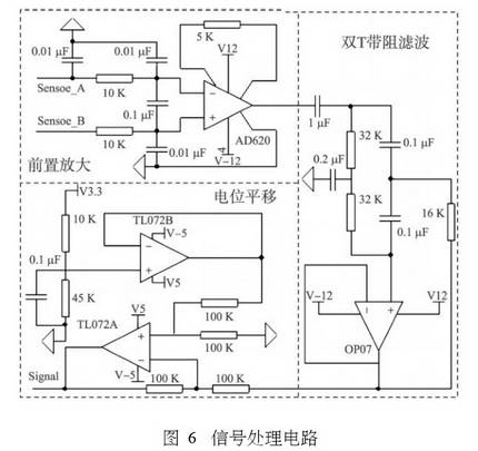 電極輸(shū)出的感應電(dian)動勢信号(微(wēi)伏至毫伏級(jí)的交🏃🏻♂️變信号(hao))首先經過RC電(dian)路濾除部分(fen)高頻幹擾信(xin)号,然後送入(rù)儀用放大器(qì)AD620進行差分放(fang)大,但是由于(yu)幹擾成份較(jiao)多,且有的幹(gan)擾信号幅值(zhí)遠大于信号(hao)本身,因此AD620的(de)增🥰益不宜設(shè)置得過大⛹🏻♀️,10~20倍(bei)爲佳。流量信(xìn)号經🌐過AD620放大(da)後,采🎯用單端(duan)輸出(對地電(dian)壓)方🐕式後通(tong)過電容隔直(zhí),濾去了直流(liu)分量,僅保留(liu)信号的交流(liú)🌈分量。由于測(cè)量電路器🈲件(jian)本身存在噪(zao)聲✔️以及其他(tā)幹擾,特💛别是(shì)50Hz的工頻幹擾(rǎo),有必要對信(xin)号再🔞次濾波(bo),在此選取了(le)雙T帶阻濾波(bō),電容C取Q1μF,中❄️心(xin)頻率f爲50Hz則R=1/?。C)=1/(2πf0C)≈321Ω。最(zui)後把正負交(jiao)變的信号進(jin)行電壓平移(yi),即整體提升(shēng)信号幅值,使(shǐ)之都爲正值(zhi)後送入🎯MCU的ADC引(yin)腳。