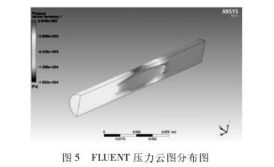 分别導(dǎo)出一組試驗(yàn)的仿真壓力(lì)雲圖進行對(duì)比,如圖5、圖6所(suǒ)📐示。由圖可知(zhī),壓力分布基(jī)本相同,COMSOL的壓(yā)力雲圖更加(jiā)立體直觀,視(shì)覺效果比FLUENT更(gèng)好。