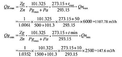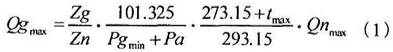 式(shi)(1)、(2)中,Qgmx、Qgnn爲最大和最(zui)小的工況體積(ji)流量(m/h),