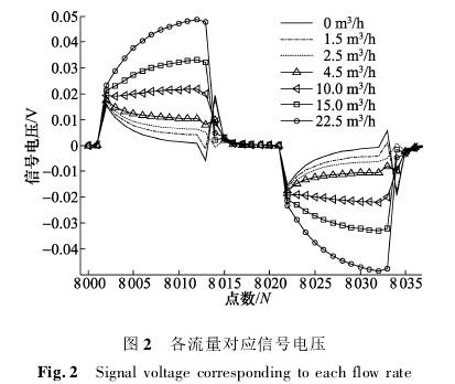 由(you)于勵磁電流(liu)沒有達到穩(wen)态,與之對應(yīng)的信号電壓(yā)也處于非穩(wěn)态過程,主要(yao)包含流量分(fen)量和微分幹(gan)擾兩部分,但(dan)是,實際采集(ji)到的傳感器(qì)信号引入了(le)直流偏置和(he)♊50Hz工頻幹擾,爲(wei)此,對信号電(dian)壓進行梳狀(zhuang)帶通濾波處(chù)理以消除直(zhí)流偏置和工(gong)♋頻幹擾。各流(liú)量下信号電(dian)壓梳狀帶通(tong)濾波後的結(jié)果如圖3所示(shì),信号電壓幅(fu)值由低到高(gao)對應的流量(liàng)依次爲0~22.5m3/h。其中(zhōng),圖2中信号電(diàn)壓與圖1中前(qian)2個半周期的(de)勵磁電流相(xiang)對應,爲正負(fù)兩個半周期(qi)。可以看出💋,在(zài)非穩态上升(shēng)過程中,信号(hao)電壓的幅值(zhi)與管道内流(liu)量大小仍🈲是(shì)相關的。當流(liú)量爲零時,信(xìn)号電壓主要(yao)🤞爲微分幹擾(rao)。