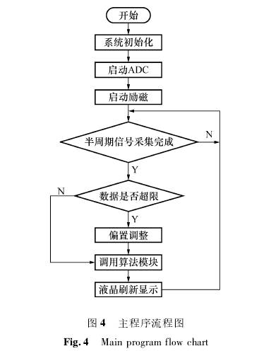 軟件(jian)設計采用模(mó)塊化設計方(fāng)案,主要功能(néng)模塊有:初始(shǐ)化模塊、驅動(dòng)模塊、數據處(chu)理模塊、人機(ji)接口模塊等(deng),程序流程圖(tu)如圖4所示。系(xì)統上電後先(xian)進行初🚶♀️始化(huà),然後配置☎️兩(liang)片ADC同步采樣(yang),開啓勵磁中(zhōng)斷,勵磁開始(shi)工作。半周期(qī)采🔞樣結束後(hou)🐅判斷采集到(dao)的信号💰電壓(yā)是否超限,之(zhī)後調用🧡算法(fa)模塊,刷新液(yè)晶顯示。在算(suàn)法模塊中,先(xian)是對采集到(dào)的信号電壓(yā)進🔆行梳狀帶(dai)通濾波處理(lǐ),再将濾波後(hou)的電壓除以(yi)對應勵磁👈電(diàn)流,然後對電(diàn)壓電流比值(zhi)進行半周期(qī)幅值解⭐調,對(duì)解調後的比(bi)值取5點求均(jun1)值作爲輸出(chu)結📧果參與到(dao)流速的計算(suàn)。