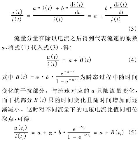 針對瞬态(tai)測量,通過對(dui)信号電壓的(de)分析,确定了(le)信号☔電壓和(hé)勵磁電流的(de)比值與流量(liàng)的線性關系(xì),提出了基于(yú)👣電壓電流比(bi)值的處理方(fāng)法。瞬态測量(liàng)勵🥵磁時間🔴短(duǎn),勵磁電流及(jí)❤️其感應産生(shēng)的磁場均未(wei)進入穩态。在(zài)勵磁電流的(de)上升過🍉程中(zhong),微分🥰幹擾隻(zhī)随㊙️時間變化(hua),而流量分量(liang)受💞到勵磁電(dian)流🐕的影響,其(qi)大小不僅與(yǔ)流速有關,還(hái)随時間🧑🏾🤝🧑🏼變化(huà)。爲了消除勵(li)磁🙇♀️電流對流(liu)🎯量分量的影(ying)響🔴,同時減小(xiao)電流波動帶(dai)來的磁場波(bo)動對信号産(chan)生的影響,将(jiāng)信🌈号電壓比(bi)上勵磁電流(liú),即式(2)比上式(shì)🐇(1),得到: