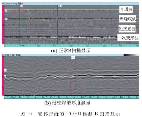 TOFD檢(jian)測流量計殼體焊(han)縫具有優勢,能有(yǒu)效地發現焊縫中(zhong)的裂紋等缺陷,此(ci)法的正常B掃描顯(xian)示具有特點,能明(míng)顯顯示焊縫的底(dǐ)波,能準确測量焊(hàn)縫的厚度,在焊縫(féng)厚度較小(如♊低于(yu)标準規定的12mm)時,焊(han)縫底波也明顯存(cun)在,但不🐅能用于缺(que)陷的檢測,TOFD檢測B掃(sǎo)描顯示如圖10所示(shi)