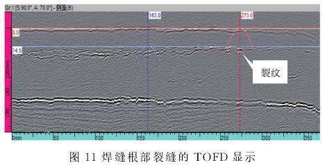 焊(hàn)縫根部裂縫的TOFD顯(xian)示如圖11所示,可見(jian)隻有裂紋的上⭐端(duān)點顯示,沒有下端(duan)點顯示,焊接接頭(tou)部位底波受到影(yǐng)響