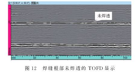 焊縫根部未焊(hàn)透的TOFD顯示如圖12所(suǒ)示,上端點出現較(jiao)直或圓弧狀斷續(xu)信号顯示,焊接接(jie)頭部位底波受到(dào)影響。