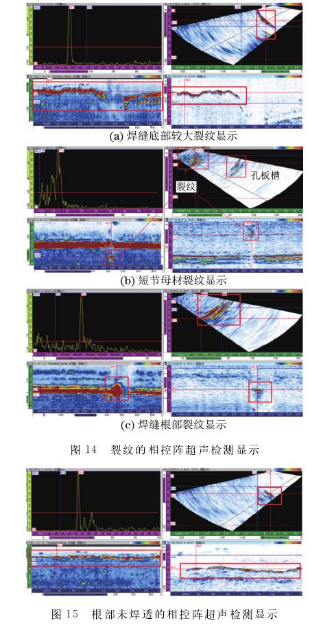 相控陣(zhen)超聲檢測殼體焊(hàn)縫根部未焊透的(de)顯示如圖🈲15所示㊙️,S形(xíng)扇掃45°角度左右時(shí)端角反射較強,C掃(sao)描長度顯示連續(xu)或斷續🧑🏾🤝🧑🏼,當深度顯(xian)示值低于要求的(de)焊縫厚度時就是(shi)未焊透。相控陣超(chao)聲檢測判定這種(zhǒng)流量計殼💚體焊縫(feng)根部未焊透缺陷(xian)有一定的難度,容(róng)易與墊闆焊縫根(gēn)部間隙産生的反(fan)射回波相混而引(yǐn)起錯判,無未焊透(tou)時一般沒有信号(hao),一旦産生🌏信号需(xu)要進一步分析。
