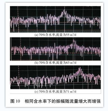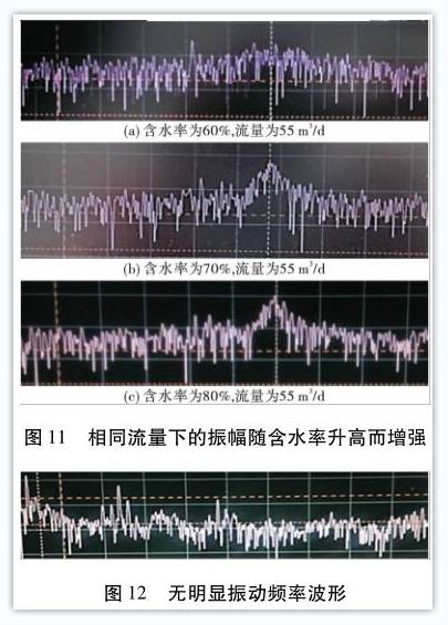 在(zài)井下渦街流(liu)量計試驗過(guo)程中,由于機(jī)械振動以及(jí)🍉外部環境會(hui)對壓電傳感(gǎn)器産生幹擾(rǎo),因此在沒有(you)流量通✨過時(shí)🧑🏾🤝🧑🏼依然會産生(shēng)一定的振動(dòng),通過傅裏💋葉(yè)變換後表現(xian)爲均布在整(zhěng)個頻域的白(bai)噪聲。将各測(ce)試條件下的(de)示波器波形(xing)進❓行整合,通(tōng)過對比發現(xiàn):當油水比例(li)固定時,在頻(pín)域分析中,旋(xuan)渦脫落所對(dui)應的頻率峰(fēng)值随流量增(zeng)大而增大,如(ru)圖10所示;當流(liu)量一定時,在(zài)頻域分析中(zhōng),旋渦脫落所(suǒ)對應的頻率(lü)峰值随含水(shuǐ)率升高而升(sheng)高,如圖11所示(shì)。上述現象說(shuo)明,該渦街流(liu)量計應用于(yú)高含水、大流(liu)量的工作🔞環(huan)境中具有較(jiao)強的抗幹擾(rǎo)性。反之,當流(liu)🍓量較小或🐇含(han)水率較低的(de)情況下,探頭(tou)檢測到的被(bei)測介質經旋(xuán)渦發生體分(fen)離後産生的(de)振動所對應(yīng)的頻率值與(yu)系統噪🌏聲産(chǎn)生振動的頻(pín)率值較爲接(jie)近,如圖12所示(shì),無法明顯區(qū)分,可♌能會導(dao)緻單片機所(suǒ)采集到的有(you)效流量值對(dui)應頻率不準(zhǔn)确,從而産📱生(shēng)了在小流量(liàng)或低含水率(lü)情況下,測👄試(shi)精度下降的(de)現象,因此需(xū)要對非常小(xiao)流量進行限(xiàn)制。