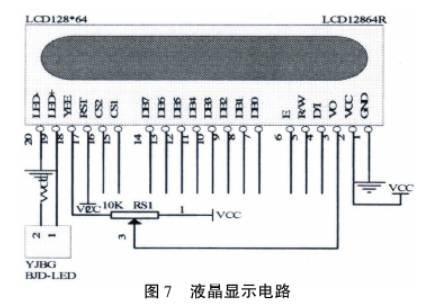 本電(diàn)路采用12864液(yè)晶來實時(shí)顯示輸出(chū)的流體質(zhi)量流量和(he)密度的大(da)小。該液晶(jīng)具有屏幕(mù)反應速度(dù)快、對比度(dù)高、功耗低(dī)等優點,可(kě)以實現友(you)好的人機(ji)交互。爲了(le)簡化電路(lu),采用串口(kǒu)連接。在單(dan)片機的控(kòng)制下,按照(zhao)要求的格(gé)式顯示接(jie)收到的數(shu)據和字符(fu)信息。圖7爲(wèi)液晶顯示(shi)的連接圖(tú)。其中D0~D7爲數(shù)據口,R/W爲液(ye)晶讀寫信(xin)号,E是使能(néng)端。