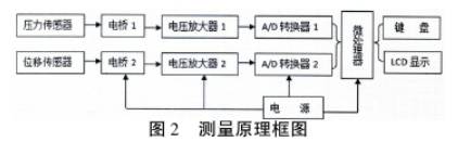 爲了(le)便于測量(liang),将差壓信(xìn)号進行放(fang)大,濾波,在(zai)利用微處(chù)理器進行(hang)控制,使之(zhi)能方便記(ji)錄、存儲和(hé)顯示。在圖(tú)1中,利用位(wèi)移傳感器(qì)可以測量(liang)出節流裝(zhuāng)置11和22管壁(bì)處的流體(tǐ)靜壓力,将(jiang)壓力的變(bian)化通過電(dian)橋的作用(yong),使之轉換(huàn)爲電壓的(de)變化,爲了(le)便于微處(chu)理器能控(kòng)制,将其信(xin)号進行放(fang)大和模數(shù)轉換。由于(yu)要測量質(zhi)量流量,在(zài)A處的壓力(li)傳感器可(kě)以測量得(dé)到流體密(mi)度的大小(xiao)(測量密度(dù)的原理是(shì)A出的容積(ji)是标定已(yǐ)知的,邇過(guò)質量大小(xiǎo)除以容積(ji)即可以得(de)到)。由此得(de)到測量原(yuan)理框圖如(ru)圖2所示。