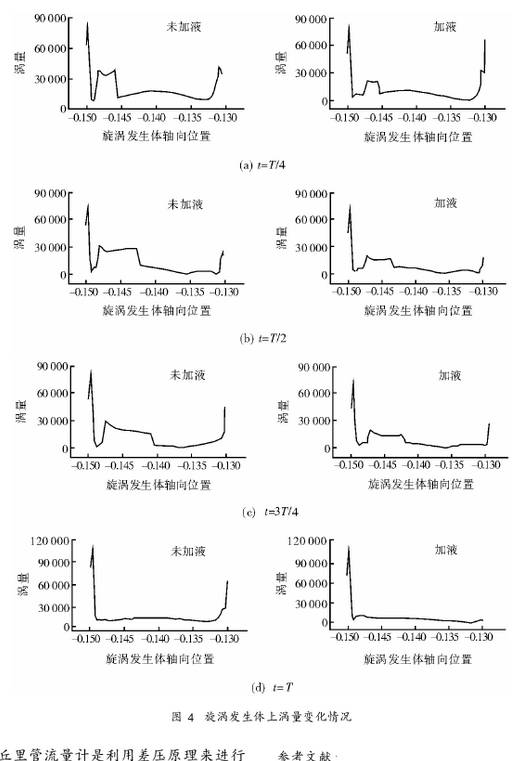 首(shou)先對渦街流量(liang)傳感器沒有液(ye)相加入時渦街(jiē)壁面.上渦量🈲的(de)變化情況進行(háng)了記錄。圖4反映(yìng)的是當♈入口🛀🏻速(sù)度🏃🏻爲20m/s時,一個周(zhōu)期❤️内不同時刻(ke)旋渦發生體壁(bì)面,上🌈渦量的變(bian)化情⛷️況,以及當(dang)氣體中注入液(yè)體💘含率爲0.1%時旋(xuan)渦發生體上一(yī)個周期内不同(tóng)時刻的👉渦量變(biàn)化。未加入液相(xiang)時可以看到旋(xuán)渦在旋渦發❗生(shēng)體上從産生到(dào)逐漸長大最後(hou)從旋渦發生體(ti)上脫落的整個(gè)過程,在開始時(shí)刻邊界層在旋(xuan)渦發生🈲體的銳(ruì)邊開始卷積♈形(xing)成旋渦,随後旋(xuán)⭕渦逐漸變大,渦(wo)量比初始時相(xiàng)對減小,最後旋(xuan)渦從旋渦發生(sheng)體上脫落,旋渦(wō)發生體壁面.上(shang)的渦量變爲零(líng)。由圖4進行比較(jiao)可以明顯地看(kàn)出,在加入液相(xiàng)以後液相的存(cun)在影響了氣體(tǐ)邊界層在壁面(miàn)上的卷積,旋渦(wō)發生體上的✨渦(wo)量明顯減小。