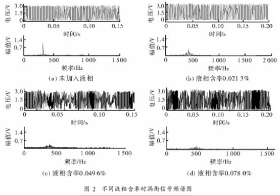 實驗的過(guò)程中保持氣相(xiang)流量爲141m3/h,對應的(de)流速爲20m/s,管道中(zhong)液相體🍉積含率(lü)分别爲0.0106%、00213%、0.0355%、0.0496%、.0.0638%、0.0780%、00922%。以5000Hz的頻(pín)率對不同液相(xiang)含率下電✂️荷放(fang)🛀🏻大器産生的正(zheng)弦信号進行采(cǎi)樣,每次采樣10組(zǔ)數據,每組數據(jù)有104個采樣點,然(rán)後把得到的采(cǎi)樣點進行傅立(lì)葉變換,得到不(bu)同液相含率下(xia)☁️渦街産生的頻(pín)率.,不同液✂️相含(hán)率時渦街信号(hao)的頻譜圖如圖(tu)2所示🏒。