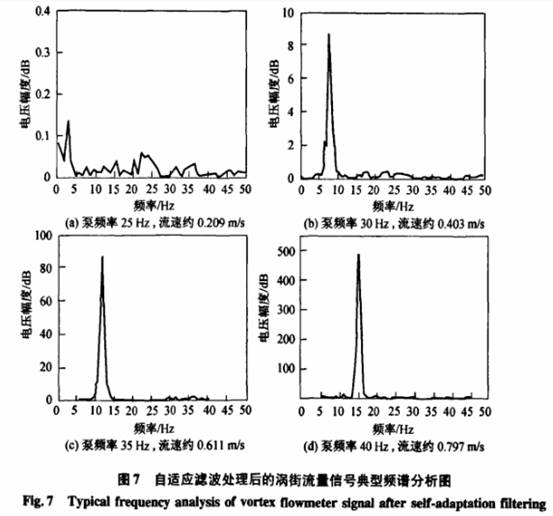 本研究對(duì)不同流速和泵(bèng)頻率組合下的(de)渦街流量信❄️号(hào)進行了數據采(cǎi)集和頻譜分析(xī),其中水泵采用(yong)格蘭富AP12.40單級潛(qián)水泵,分别調節(jiē)流速約0.209,0.403,0.611,0.797m/s.控制水(shuǐ)流速的大小,在(zài)每一開度下,再(zài)分别設置水泵(beng)工作頻率爲25,30,35,40Hz,以(yǐ)輸人🐅不同的振(zhèn)動幹擾信☁️号,如(ru)圖2所示.可見當(dang)流速小時噪📞聲(shēng)能量接近♌甚至(zhi)大于實❌際信号(hào)能量👉,在線的頻(pin)譜分析很難判(pan)斷..