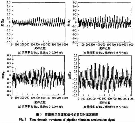 試驗工作(zuo)狀态:分别調節(jiē)流速約爲0,0.209,0.403,0.611,0.797m/s,控制(zhi)水流速的大🈲小(xiao)🏃,并在每--開度下(xià),再分别設置水(shuǐ)泵工作頻率爲(wèi)25,30,35,40Hz.加速度傳感器(qi)的模拟輸出信(xìn)号輸人到PC機的(de)A/D采集卡,采樣🏃🏻♂️頻(pín)率1000Hz.對不同流速(su)和泵頻率組合(hé)下的管道振動(dòng)信号進行數據(jù)采集和頻譜分(fen)析.圖3爲所有組(zu)合下,采樣得到(dào)的管道振動加(jia)速度信号的典(dian)型時💃域波形圖(tú).圖中橫坐标爲(wei)采樣的點數,共(gòng)1024點;縱坐标爲相(xiang)對于♻️Og标定值的(de)差值,縱坐标基(ji)準值0對應了0g的(de)标定值.圖4所示(shi)爲對應的管道(dào)振動信号的典(dian)型頻⭕譜圖.