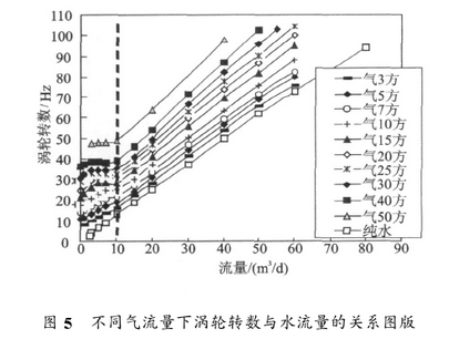 在氣1水兩相(xiang)流下的響應規(guī)律。在氣/水兩相(xiàng)流條件下,渦輪(lun)在低流量和高(gao)流量時有不同(tong)的規律,在水⛷️流(liu)量爲10m³/d以上,保㊙️持(chí)氣量不變,渦輪(lún)響應與水流量(liang)呈線性關系,并(bing)且🤟随着氣量的(de)增加,渦輪響應(yīng)與水流量關系(xì)直💃線的斜率(即(ji)渦輪K值)增加。在(zài)低液量下(<10m2/d)渦✍️輪(lún)更敏感于氣,氣(qi)量達到20方以上(shang)時對水失去了(le)分辨率。在水流(liú)量低于10m³/d時,渦輪(lun)響應值波動大(dà),水流量10m³/d以上時(shí),随着流量增大(da),波動越來越小(xiao)。.
