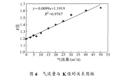 保持氣(qi)量不變,取水相(xiang)流量10m³/d及以上時(shí)的數據,計算渦(wo)輪響應與🌏水流(liú)量關系直線的(de)斜率(即K值),然後(hou)做🔞出氣💃流量與(yǔ)K值的關🙇🏻系圖版(bǎn)如圖6所示5随着(zhe)氣相流量的增(zeng)📧加,K值近似呈線(xiàn)性增加👉。