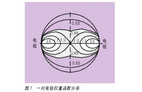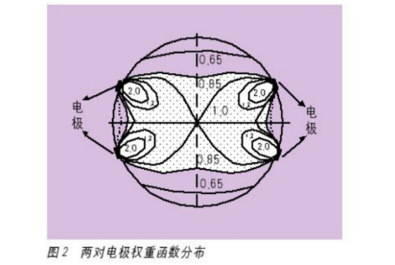 這(zhè)是宏觀地闡明(míng)電磁流量計的(de)工作原理,假設(shè)磁通密度B是均(jun)勻分布的,流速(su)是處處相等的(de)。實際上并非如(rú)此,且管道内🌈不(bú)同位置微流元(yuan)産生的電動勢(shì)不會等同地全(quán)部貢獻給兩電(diàn)極間流量信号(hao)。這是由于不同(tóng)位置介質的短(duan)路效應形成🌈的(de)衰減不同,使電(dian)極附近微流元(yuán)貢獻大,遠離電(diàn)💚極微流元貢獻(xiàn)小。引入權重函(hán)數w描述此現象(xiàng),即微流元dτ産生(shēng)的電動勢在⛱️電(dian)極上的電壓📞dE = BVwdτ。傳(chuán)統點電極電磁(cí)流量計的權重(zhong)函數分布如🌍圖(tú)1所示,所繪等權(quan)重函數線近電(diàn)極w=2,遠離✌️電極w=0.65。