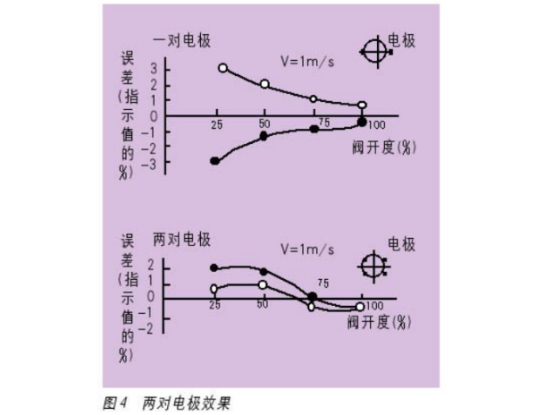 橫河(hé)電機(日)以流速(sù)分布畸變顯著(zhe)的各種開度閘(zhá)閥爲擾流件🔞,置(zhi)于流量傳感器(qì)上遊3D處,以電極(ji)軸與閘閥開啓(qǐ)☔方向平行和垂(chuí)直兩種姿勢(見(jian)圖4),4種閘閥開度(du),即25%、50%、75% .和全開⁉️,作流(liú)速1m/s的實流實驗(yàn)。結💞果如圖5所示(shì),閘閥開度在(25~ 75)%範(fan)圍,兩對電極儀(yí)表比一對電極(jí)儀表誤差可減(jian)小一半以上,從(cóng)🏃♂️而可縮短前置(zhi)直管長度。