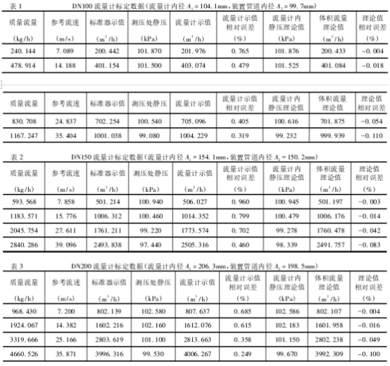 通(tōng)過使用(yòng)文丘裏(li)噴嘴氣(qì)體流量(liang)标準裝(zhuang)置對三(san)個不同(tong)規格的(de)E+H渦街流(liu)量計進(jin)行标定(dìng),由标準(zhun)器測量(liang)及密度(du)換🙇♀️算得(dé)Qm、P2、ρ2,使用遊(you)标卡尺(chǐ)分别測(cè)量流量(liang)計與裝(zhuang)置管道(dao)内徑A1、A2,并(bing)計算兩(liang)者通徑(jìng)截面積(ji)S1、S2、收縮系(xì)數Cc、測壓(ya)處截✂️面(mian)參考流(liu)速v2、單位(wei)質量流(liu)體的能(néng)量損失(shī)🌈U,利用MATLAB軟(ruan)件中的(de)solve函數求(qiú)解式(14),得(dé)流量計(ji)内氣體(ti)的理💘論(lùn)密度ρ1,理(lǐ)論靜壓(yā)P1,根據式(shi)(15)得理㊙️論(lun)體積流(liú)量QV,計算(suàn)其與标(biāo)準裝♈置(zhì)體積流(liu)量示😄值(zhí)的相對(dui)誤差。表(biǎo)1~3爲三種(zhǒng)規格流(liú)量計的(de)實驗數(shù)據
