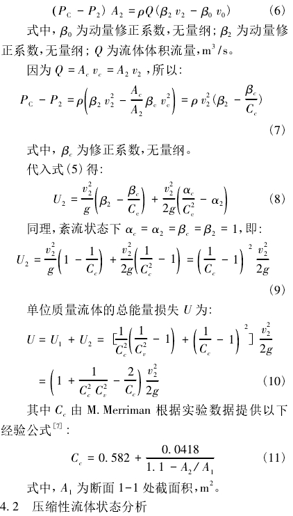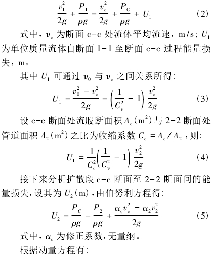 實際上(shang)從1-1斷面(mian)至c-c斷面(miàn)間存在(zài)一定能(neng)量損失(shī),假設🛀🏻爲(wèi)U1,再者💋c-c斷(duan)面🈲的實(shí)際平均(jun1)流速νC要(yao)比v0稍小(xiǎo)一些,它(ta)們的比(bi)👉值νC/v0=Cν,稱爲(wèi)流速系(xì)數,一般(ban)約爲0.99~0.97[7],基(ji)于本文(wen)所讨論(lùn)情況,該(gai)斷面收(shou)縮較小(xiǎo),取Cν=0.99計算(suan),且在紊(wěn)流狀态(tài)下α1=α0=1,即: