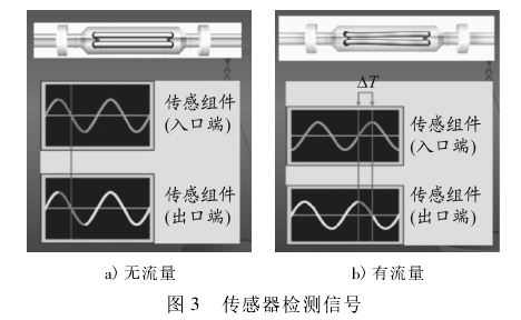 當U形管(guan)内無流體(ti)流過時,振(zhen)動管不産(chǎn)生扭曲,振(zhen)動📞管兩側(cè)🐉電磁信号(hao)檢測器檢(jian)測到的信(xin)号是同相(xiang)位的,見圖(tu)3a;當U形管内(nèi)有流體流(liú)過時,振動(dòng)管在力矩(ju)作✊用下産(chǎn)生扭曲,2個(ge)檢測器間(jiān)将存在相(xiang)位差,見圖(tu)3b。用變送器(qi)測量左、右(you)檢測信号(hao)之間的滞(zhì)後🤩時間,将(jiang)這個時間(jiān)差乘以流(liu)量标定因(yin)數,就可确(que)定質量流(liú)量。因此,質(zhì)量流量越(yuè)大,扭曲越(yuè)大,也即相(xiang)位差越大(dà)。