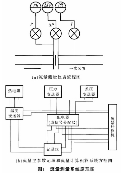 當流體(ti)流經管道(dao)中的孔闆(pǎn)時,流束将(jiāng)在孔闆處(chu)形成局部(bù)收縮(像河(hé)流中的狹(xia)小處一樣(yàng)),流速增加(jia)、靜壓力降(jiang)低,在孔闆(pan)前後産生(sheng)微小的靜(jing)壓力差(稱(chēng)爲差壓)。流(liú)體的流速(sù)增快,孔闆(pan)前後産生(sheng)的差壓相(xiàng)應增大,從(cong)而可以通(tōng)過測量差(chà)壓來間接(jie)測量天然(rán)氣流量的(de)大小。流量(liàng)測量系統(tong)原理如圖(tu)1所示,(a)爲流(liú)量測量儀(yi)表流程圖(tu);(b)爲流量主(zhǔ)參數記錄(lù)和流量計(jì)算積算系(xì)統方框圖(tú)。