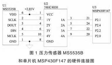MS5535B與單(dan)片機MSP430F147的通信是(shì)通過3線同步的(de)串行接口實現(xiàn)的✨。圖1爲壓力傳(chuan)感器MS5535B和單片機(ji)MSP4320F147的硬件連接圖(tu)。單片機MSP430F147的P2.1引腳(jiǎo)輸出同步🔞串行(háng)📐時鍾信号,P2.4引腳(jiao)采樣由MS5535B輸出的(de)數據,P2.2引腳輸出(chu)數據給MS5535B,P2.0引腳向(xiàng)MS5535B輸🚩出32.768kHZ的主時鍾(zhōng)信号。