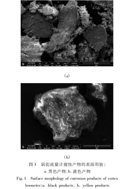 渦街流量計(ji)在四氧化二(èr)氮加注系統(tǒng)中長期使用(yong)💔,其表面存在(zài)一定厚度且(qie)分布不均的(de)黑色和黃色(se)腐蝕産物,黑(hēi)色腐蝕産物(wù)數量明顯更(geng)多。爲了觀察(cha)腐蝕産物的(de)微觀表面形(xíng)貌,将其從渦(wō)街流量計表(biao)🈲面剝離并進(jin)行SEM分析,其形(xíng)貌如圖1所示(shì)。